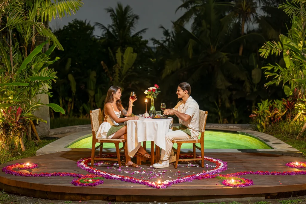 Wander through rice fields at sunrise, create canang sari, or join our village trek to feel the island’s heartbeat. Reconnect through yoga or purification rituals, and end your day with a romantic dinner beneath the stars moments that linger long after you leave.